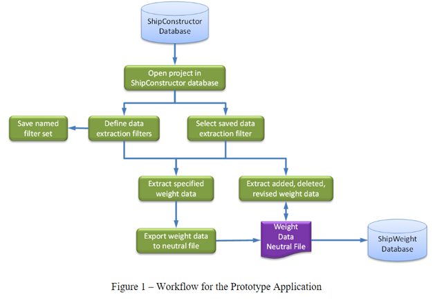 The principal workflows for the prototype application are shown in the figure below. Each starts with the user opening a project in an existing ShipConstructor database that has been fully or partially populated with parts. Opening the project allows the prototype application to retrieve the current parts list and to identify and cache lists of valid values for various part properties (e.g., the list of valid block numbers or SWBS groups). The next step is for the user to select the data that is to be extracted from the database. This is done by creating the data extraction filters that define the block(s), discipline(s), SWBS group(s), drawing(s), planar group(s), and drawing revision(s) for the data to be extracted. A collection of these filters can be saved as a named filter set for future use. If any named filter sets have been previously saved, the user can choose a saved filter set and apply it directly or modify it. After the data extraction filters have been defined, the filtered weight data can be extracted from the parts list and then exported to a neutral file format by the user. The neutral file, which will contain sufficient information to define not only the part/weight data but also the lineage of this data, can then be imported into ShipWeight. During the ShipWeight import, items that already exist in the ShipWeight database are updated as appropriate, and any items that were deleted from the ShipConstructor model but had been previously imported into ShipWeight are deleted. Because the neutral file contains information about the weight data lineage (such as the definition of the filters that were applied), it can be used in an alternative workflow in which the user just extracts added, deleted, or modified part information from the ShipConstructor database relative to a prior data extraction. The architecture of the prototype software intended to facilitate these workflows is described in the following section.