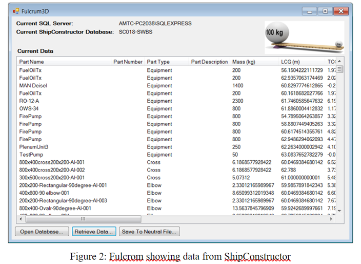 The solution selected to accomplish the weight data transfer from CAD to the weight tool has been to develop a middleware software component, called Fulcrum. The Fulcrum application acts as the facilitator of the data exchange by extracting the data from ShipConstructor and preparing it for consumption by ShipWeight.